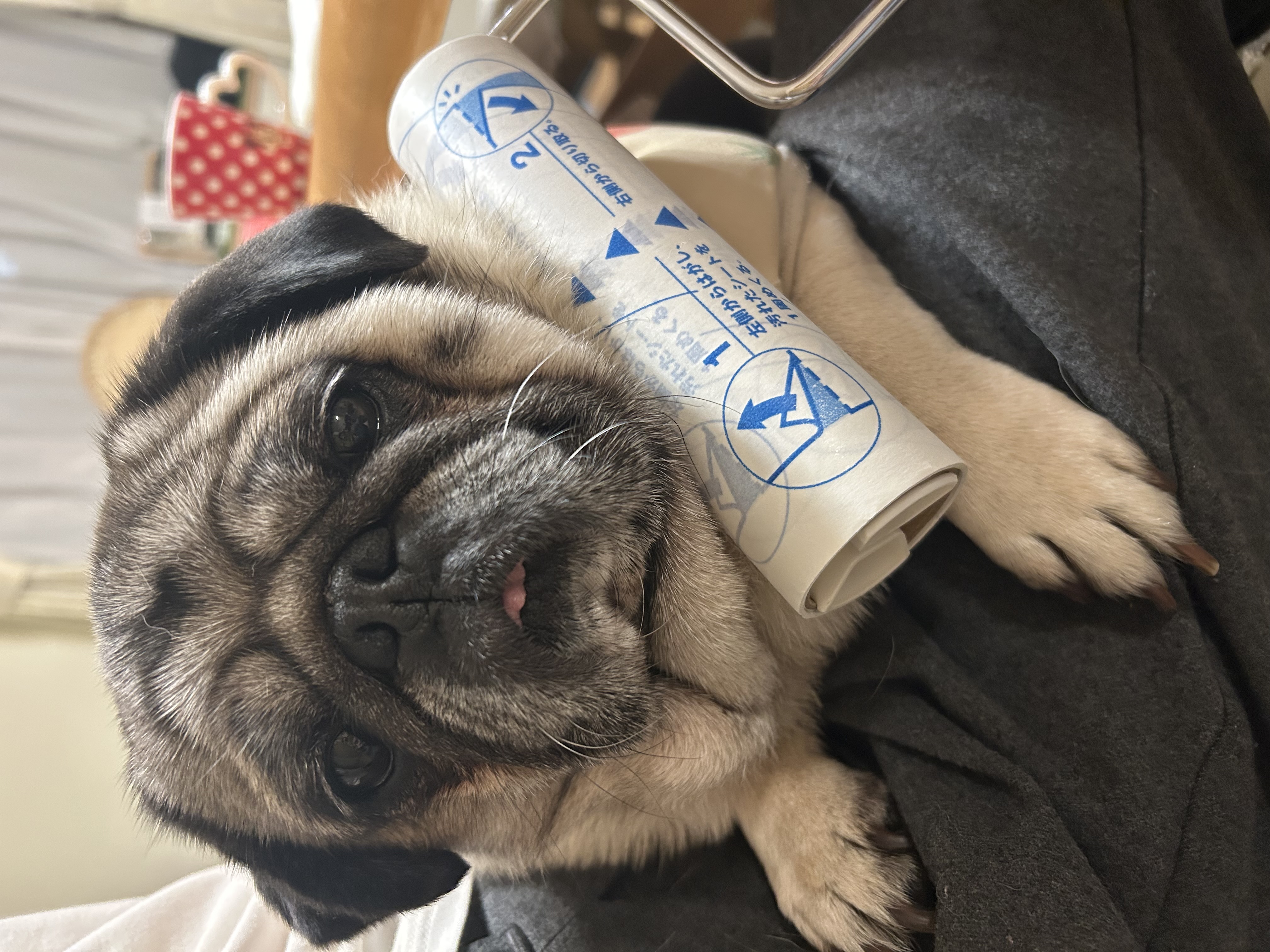 人間用の衣服ローラーで、パグちゃんもコロコロ~。