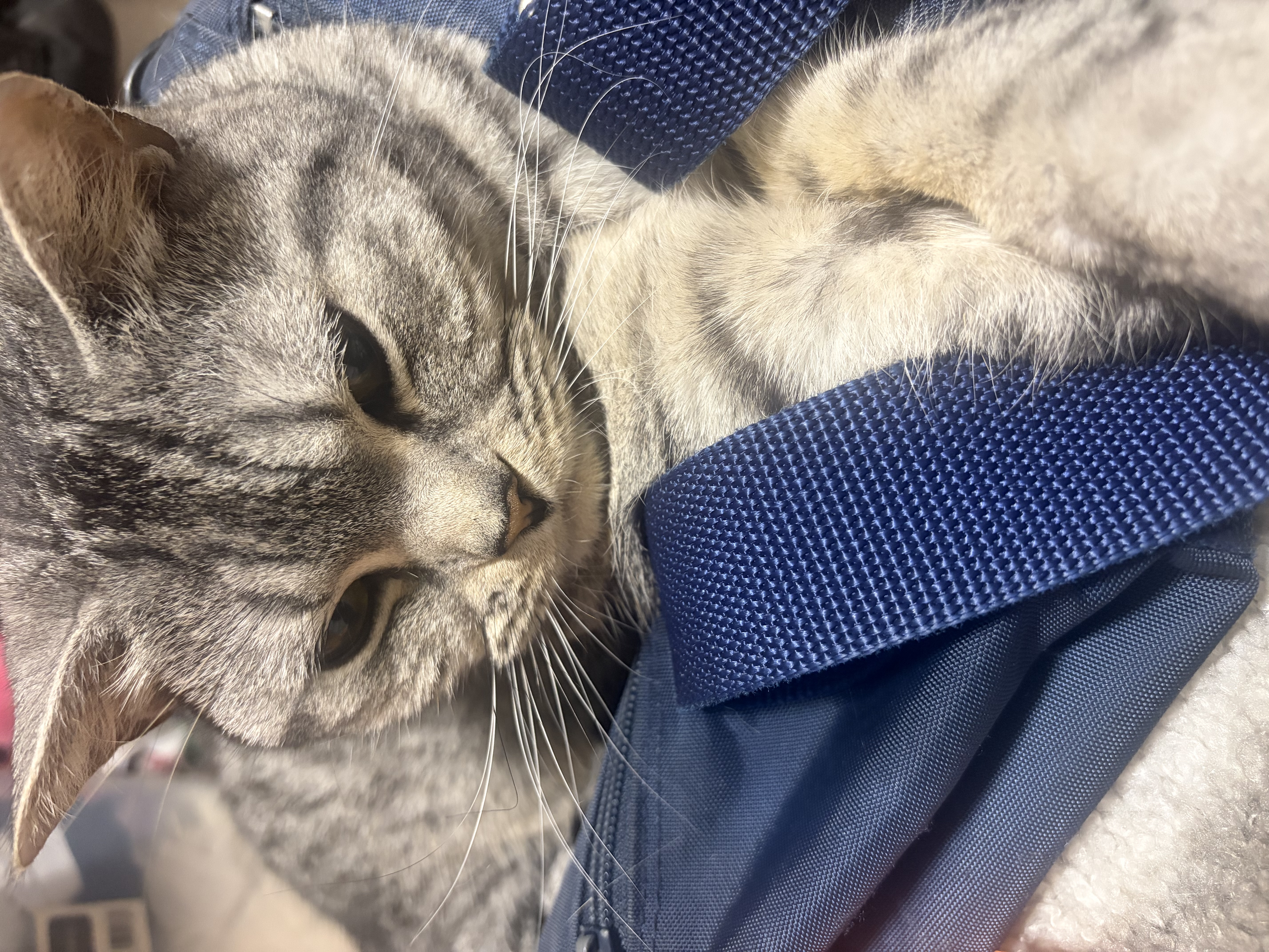 息子の学校のカバンの上で気持ちよさそうにしていて